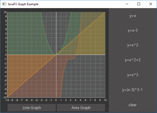 }MyGraph is a wrapper object that takes in a XYChart which both LineChart and AreaChart are and has some methods to plot and clear lines. This code could be in MainAppController as there isn’t much code in it but it looks much tidier like this. It uses the plotLine code shown above although it is split out into a two methods instead.