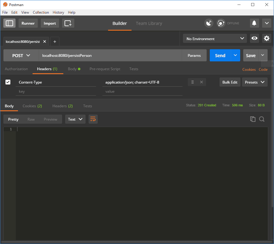 As POST requests are meant to be used to save new data to a database this example does just that, although none of the actual persistence code is actually implemented. If the input person is valid then it will call the repositories persist method and return a HttpStatus.CREATED (201) response code. This is the response code that is normally returned from a successful POST request. If the person was not valid then it returns a different response code. I used I_AM_A_TEAPOT (418) as it looked silly but it should probably be NO_CONTENT (204) or CONFLICT (409) although I there does not seem to be a consensus on what the correct response is.