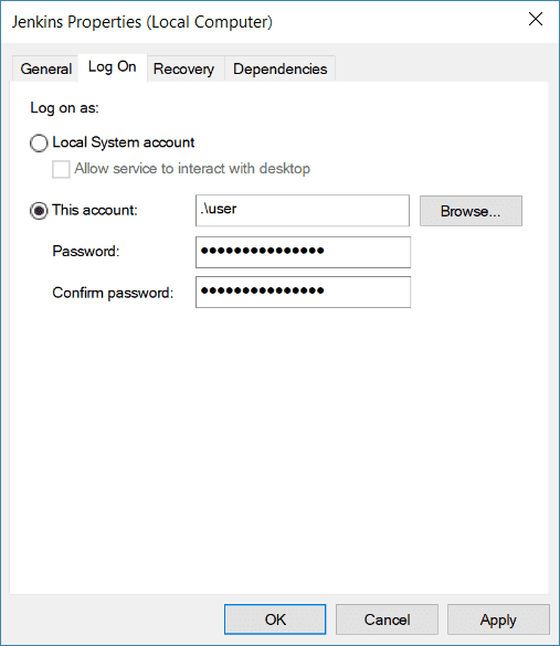 Although we are still not finished here. Due to using Windows a little more needs to be done to get this connection to Heroku to work. The Jenkins service needs to be logged on as the user of the machine that the SSH key was registered to. To do this simply open up the Windows Services, which can be done by typing “services” into the Windows start menu. Find the service named Jenkins and right click it so that the properties can be accessed. Go to the Log On tab and enter you Windows username.