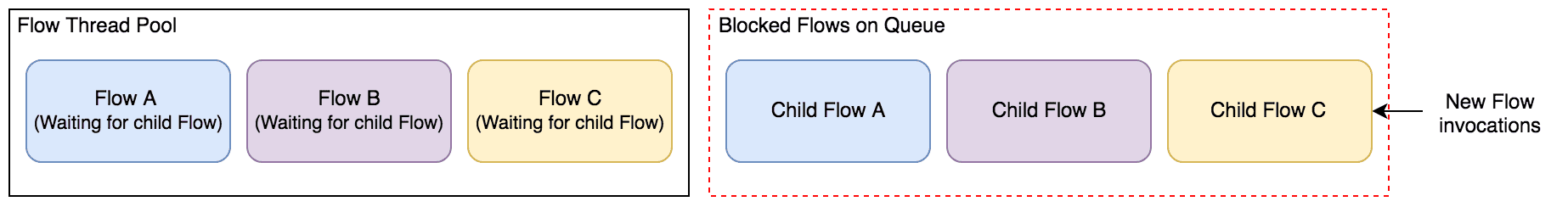 This is also the reason for the Executor thread pool, rather than CompletableFutures. By starting new Flows and not waiting for their completion, deadlock can be avoided. This is also the downside of this solution. Without the results of the new Flows, its capabilities are extremely limited.